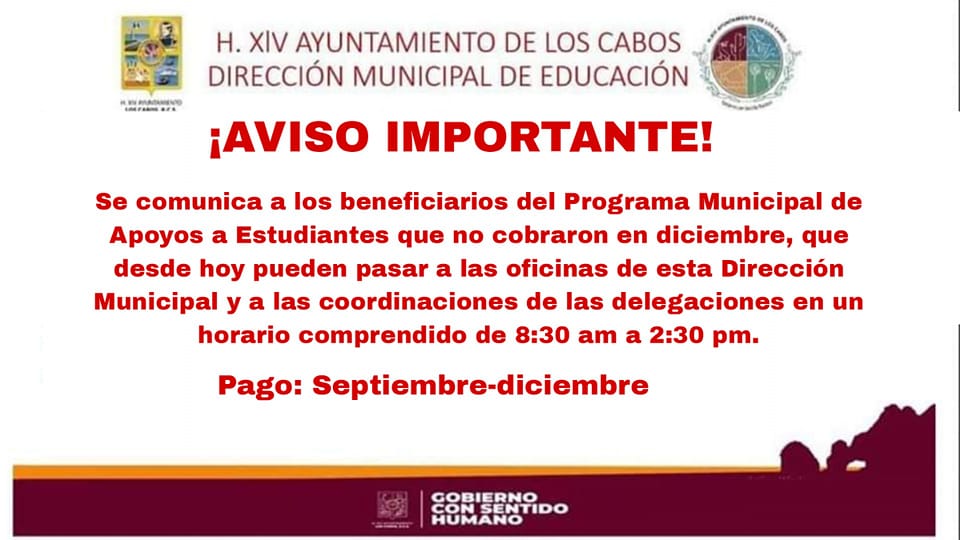 El XIV Ayuntamiento de Los Cabos que preside Oscar Leggs Castro, a través de la Dirección Municipal de Educación a cargo de Jorge Ernesto Servín Meza, hace un llamado a la comunidad estudiantil que aún no pasa a cobrar su “Apoyo Económico a Estudiantes” de los bimestres septiembre-octubre y noviembre-diciembre, a ir a las oficinas en la cabecera municipal y las 4 delegaciones en un horario de 8:30 de la mañana a 2:30 de la tarde, ya que el día 09 de enero es el último día para recibir este recurso.