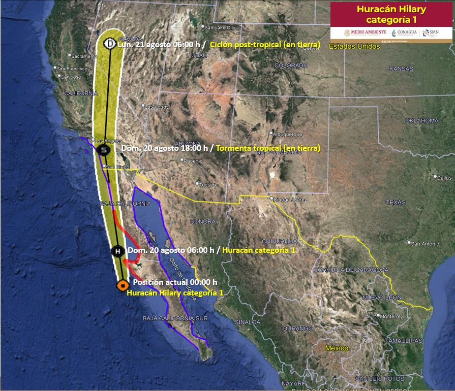 El huracán Hilary de categoría 1 en la escala Saffir-Simpson, continúa debilitándose, sin embargo, sus extensas bandas nubosas mantienen la probabilidad de lluvias muy fuertes a puntuales torrenciales en la Península de Baja California y el noroeste del país, rachas fuertes de viento en dichas regiones y oleaje elevado en zonas costeras.