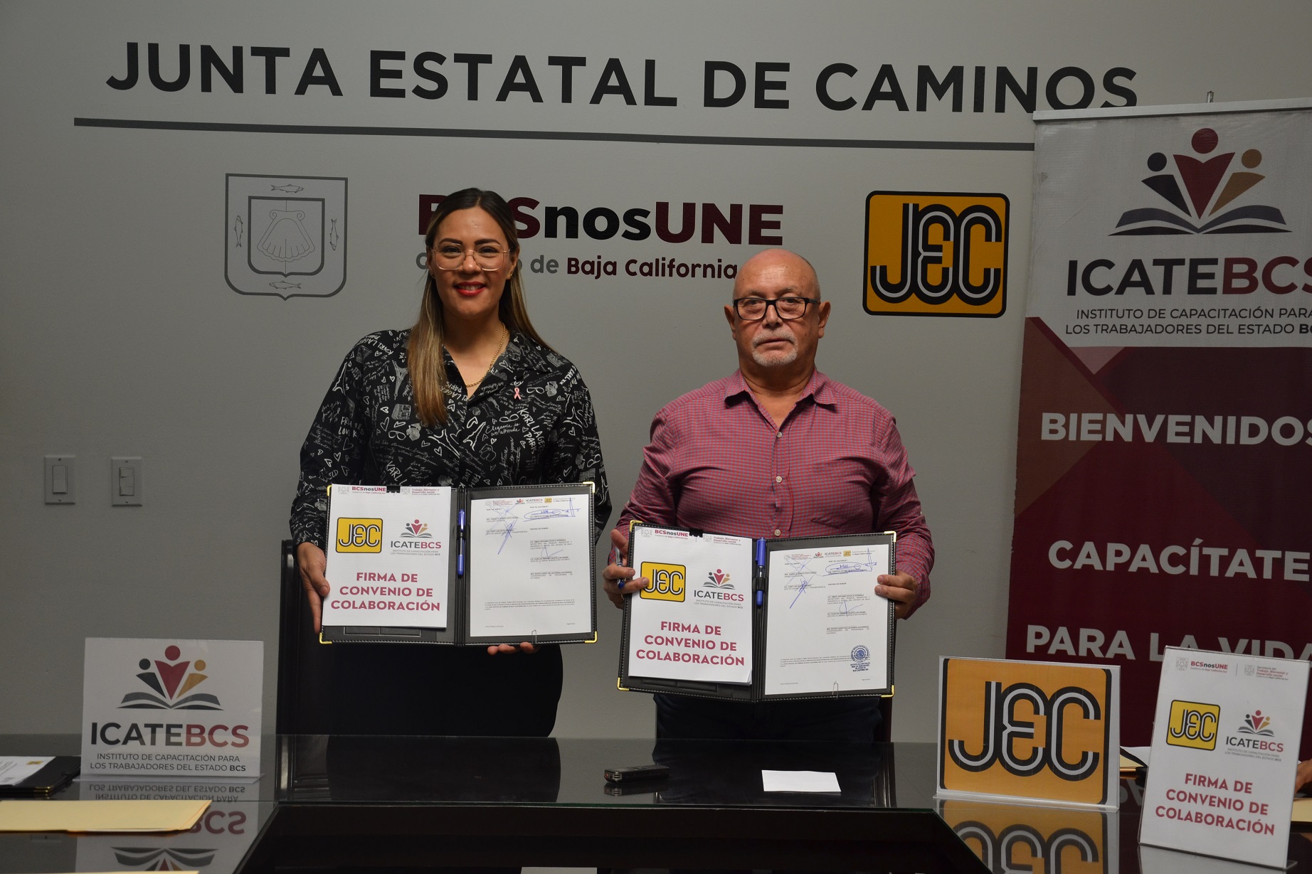 El Instituto de Capacitación para los Trabajadores del Estado de Baja California Sur (ICATEBCS), en alianza con la Junta Estatal de Caminos (JECBCS), firmaron convenio de colaboración con el objetivo principal de fortalecer los conocimientos de las y los trabajadores de este organismo, así lo comunicó la directora general Cinthya Fátima Montufas Chávez.