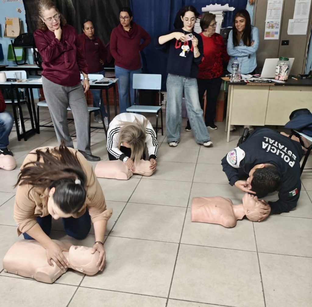 Durante la capacitación, el personal docente aprendió técnicas de reanimación cardiopulmonar, control de hemorragias, atención de quemaduras y maniobras para la obstrucción de vías aéreas, esenciales para preservar la vida mientras se recibe atención médica especializada.