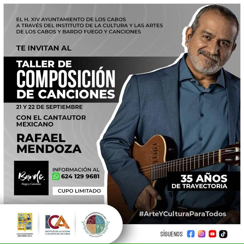 Como parte del festejo del 3er Aniversario de Bardo Fuego y Canciones, el XIV Ayuntamiento de Los Cabos a través del Instituto de la Cultura y las Artes de Los Cabos (ICA), estará realizando el Taller de Composición de Canciones con el cantautor mexicano Rafael Mendoza, uno de los compositores mexicanos más importantes del país, este 21 y 22 de septiembre para 15 personas en la Casa de la Cultura “Profesor Alfredo Green González” de San José del Cabo.