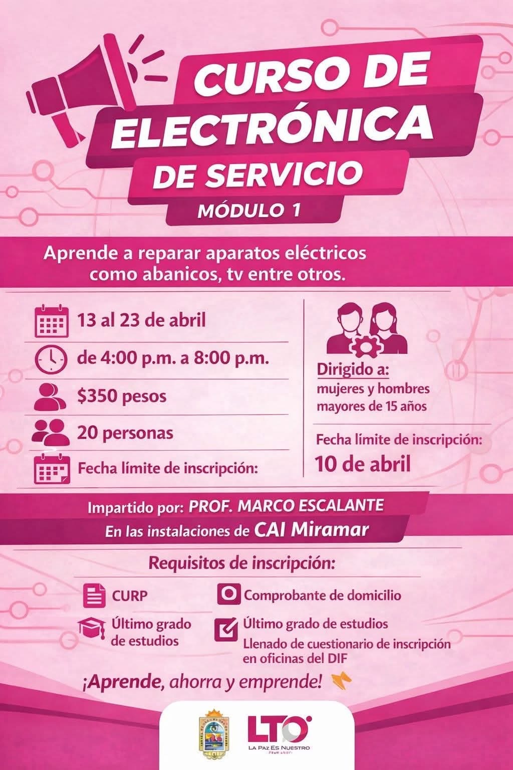 Loreto, B.C.S.– 13 de marzo de 2026.- Con el objetivo de promover la capacitación técnica, la igualdad de oportunidades y la autonomía económica de la población, el Sistema Municipal DIF de Loreto invita a mujeres y hombres mayores de 15 años a participar en el Curso de Electrónica de Servicio – Módulo 1, que se impartirá del 13 al 23 de abril en las instalaciones del CAI Miramar.