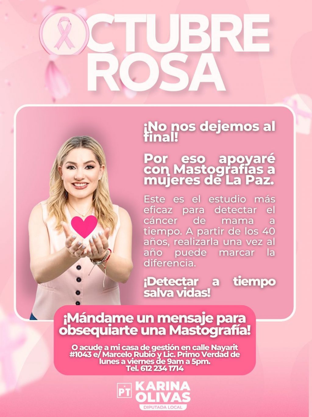 La Paz, BCS 20 de octubre del 2025.– En el marco del Día Internacional de la Lucha Contra el Cáncer de Mama, la Diputada Karina Olivas Parra lanzó el programa “No te dejes para después”, una iniciativa solidaria que busca fomentar la detección temprana y brindar apoyo integral a mujeres que enfrentan o han superado esta enfermedad.