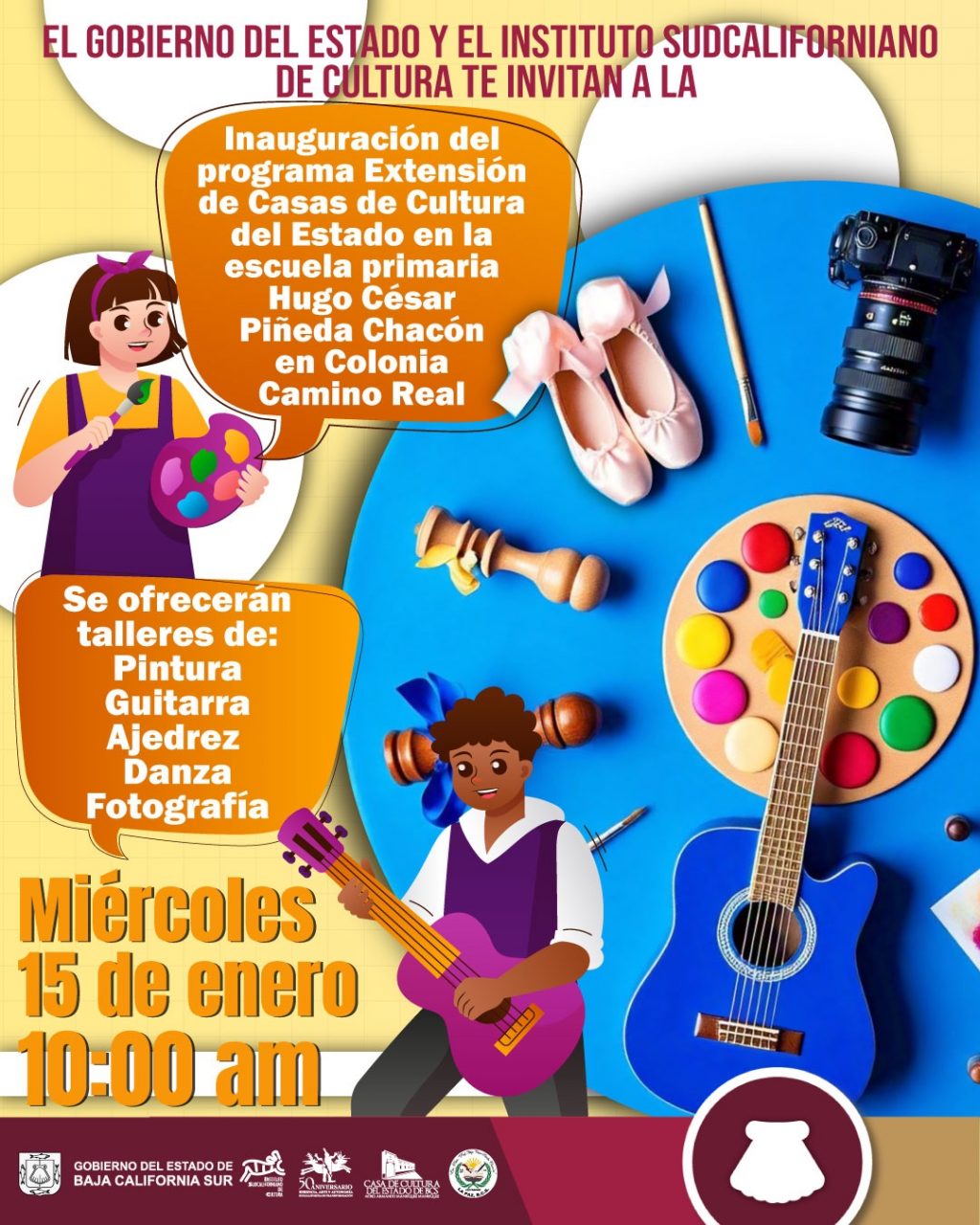 El Gobierno del Estado a través del Instituto Sudcaliforniano de Cultura (ISC) tiene el gusto de invitar a toda la comunidad a la inauguración del programa “Extensión de Casas de Cultura del Estado”, este miércoles 15 de enero a las 10:00 horas en la Escuela Primaria Hugo César Piñeda Chacón, ubicada en la colonia Camino Real.