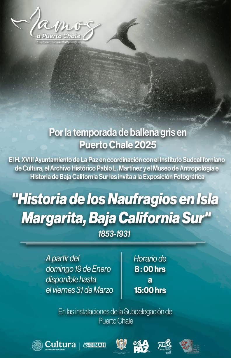 El Instituto Sudcaliforniano de Cultura (ISC) se complace en anunciar la inauguración de la exposición «Historia de los Naufragios en Isla Margarita, Baja California Sur», que se llevará a cabo en la Subdelegación de Puerto Chale a partir del 19 de enero del presente año, con el objetivo de redescubrir y conectarse con las historias del mar en esta temporada de la llegada de la ballena gris en dicha comunidad.