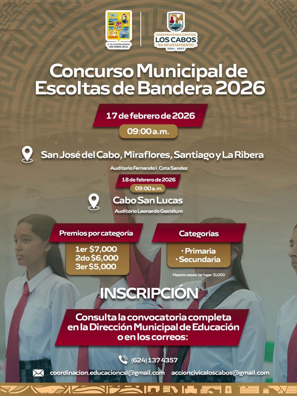 Los Cabos, Baja California Sur | 19 de enero del 2026.– El XV Ayuntamiento de Los Cabos, a través de la Dirección General de Desarrollo Social y la Dirección Municipal de Educación, convoca a alumnas y alumnos de instituciones educativas públicas y privadas de nivel primaria y secundaria a participar en el Concurso Municipal de Escoltas 2026, con el objetivo de fortalecer los valores cívicos, el respeto a los símbolos patrios y la disciplina escolar.