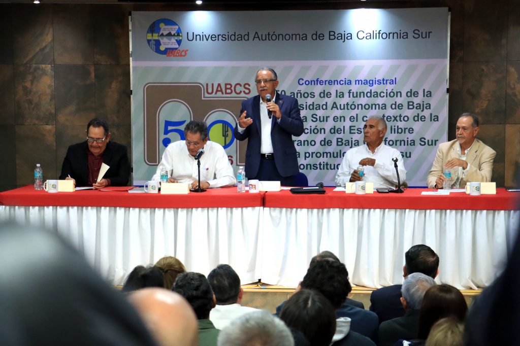 En el marco del inicio de las actividades conmemorativas por el 50 Aniversario de la Universidad Autónoma de Baja California Sur, se llevó a cabo la conferencia magistral titulada “A 50 años de la fundación de la UABCS en el contexto de la creación del Estado libre y soberano de Baja California Sur y la promulgación de su Constitución Política”, un espacio de reflexión histórica que permitió dimensionar la trascendencia de la institución en el devenir social, político y cultural de la entidad.