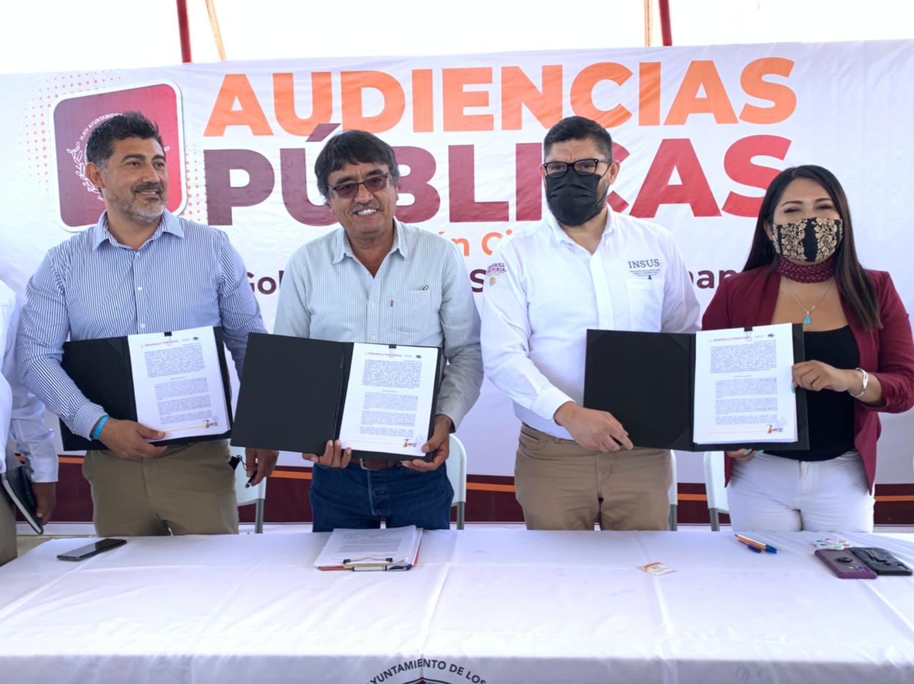 Durante las Audiencias Públicas en la colonia Los Cangrejos, se celebró el convenio de colaboración para la gestión y regularización de la tierra entre el Ayuntamiento de Los Cabos y el Instituto Nacional del Suelo Sustentable (INSUS), lo que vendrá a beneficiar a 900 predios en una primera etapa.