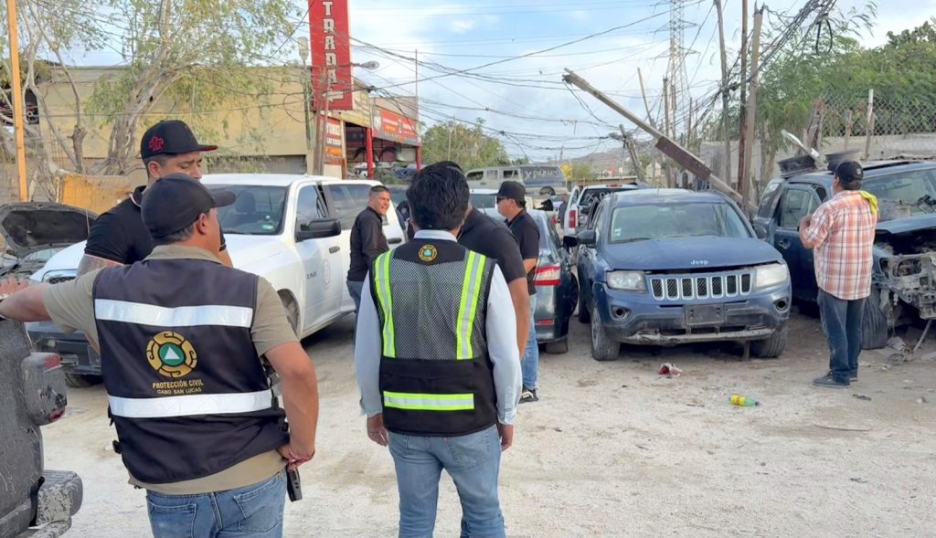 Los Cabos, Baja California Sur | 6 de junio del 2025.– Por instrucciones del presidente municipal Christian Agúndez Gómez y en coordinación con la delegada de Cabo San Lucas, Karina de la O Uribe, las coordinaciones delegacionales de Protección Civil, Tránsito Municipal, Inspección Fiscal, Ecología e Ingresos realizan recorridos de inspección en yonkes que operan de forma irregular en distintas zonas de la delegación.