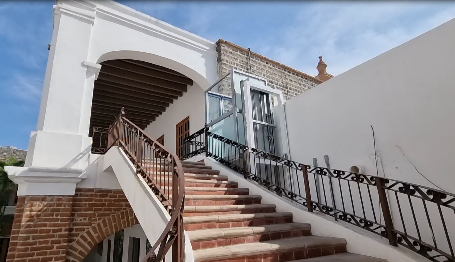 Al contar el inmueble histórico con dos niveles y una extensa escalera, el sistema permite que, desde la primera planta, donde se colocó una barandilla de protección, se dé apertura para acceder al elevador que en su interior tiene controles para subir o bajar, alerta y pistones de seguridad para cerrarlo; el módulo al llegar al nivel superior, cuenta con una rampa de descenso.