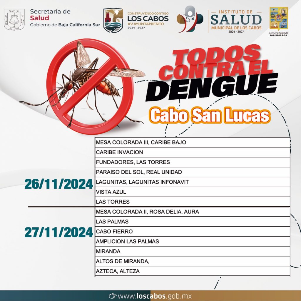 Los Cabos Baja California Sur.- La Dirección Municipal de Salud, informa a la población de Cabo San Lucas, los horarios y las colonias donde se estarán llevando a cabo las jornadas de fumigación para erradicar el mosco trasmisor del dengue y cortar la cadena de contagios, así lo dio a conocer el titular de esta área Dr. Juan Carlos Costich Pérez.