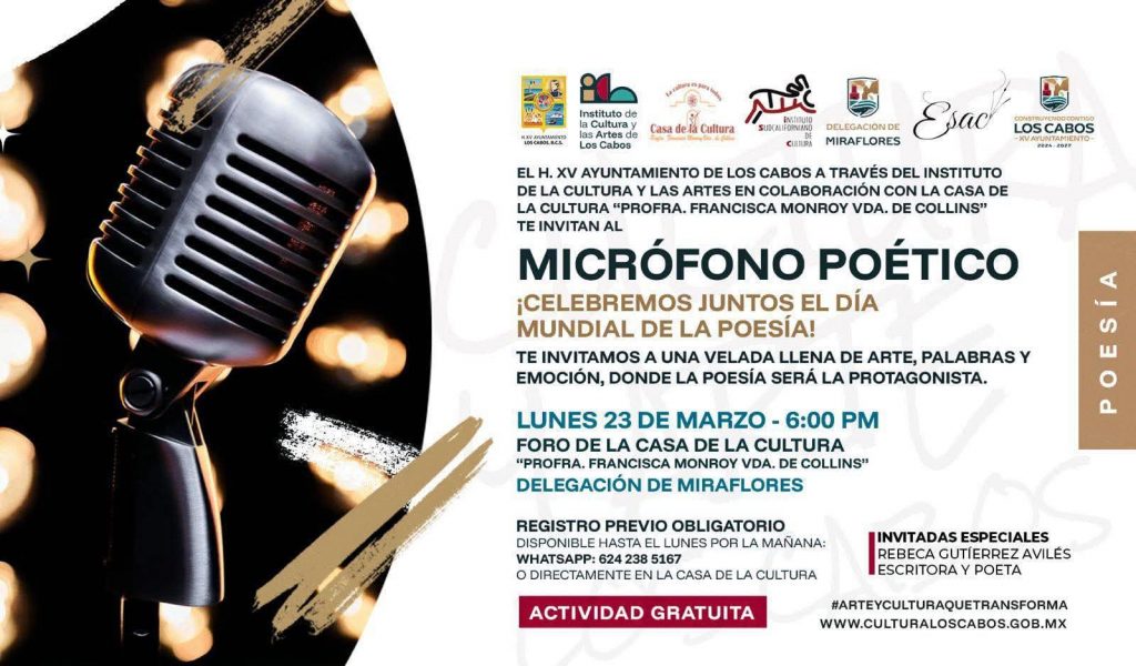 Los Cabos, Baja California Sur.– En el marco del Día Mundial de la Poesía, el XV Ayuntamiento de Los Cabos, a través del Instituto de la Cultura y las Artes (ICA) y en coordinación con la Delegación de Miraflores, invita a la ciudadanía a participar en el evento “Micrófono Poético”, que se realizará este lunes 23 de marzo.
