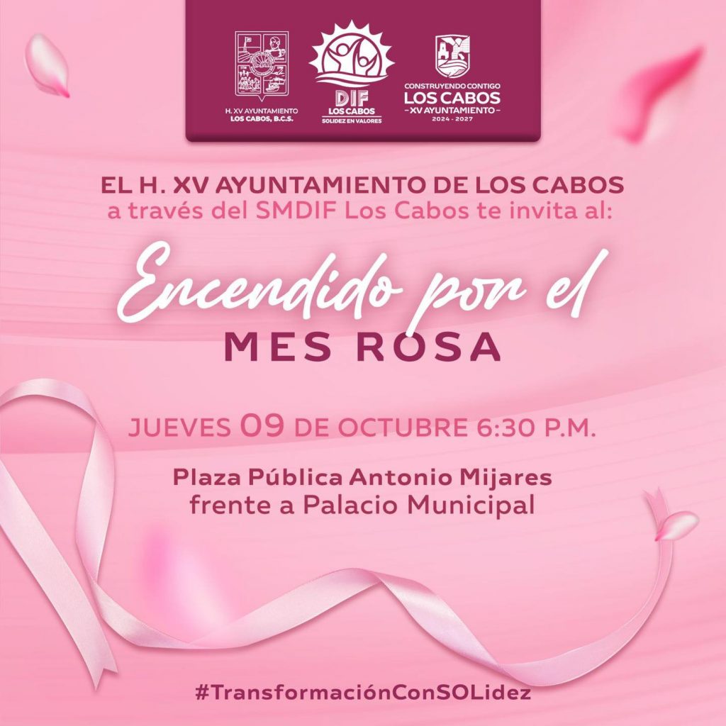 Los Cabos, Baja California Sur | 9 de octubre del 2025.- Tras haber sido pospuesto debido al paso del huracán “Priscilla”, el XV Ayuntamiento de Los Cabos, a través del Sistema Municipal para el Desarrollo Integral de la Familia (DIF), anuncia que el encendido del palacio municipal en color rosa se llevará a cabo hoy jueves 09 de octubre a las 06:30 de la tarde, en la plaza pública Antonio Mijares de San José del Cabo.