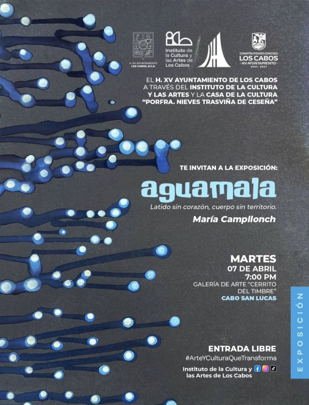 Los Cabos, Baja California Sur | 3 de abril del 2026.– Con el propósito de seguir fortaleciendo la promoción artística y cultural en el municipio el Instituto de la Cultura y las Artes de Los Cabos, invita a la ciudadanía a la inauguración de la exposición de arte “Agua Mala, latido sin corazón, cuerpo sin territorio”, de la artista María Campllonch.