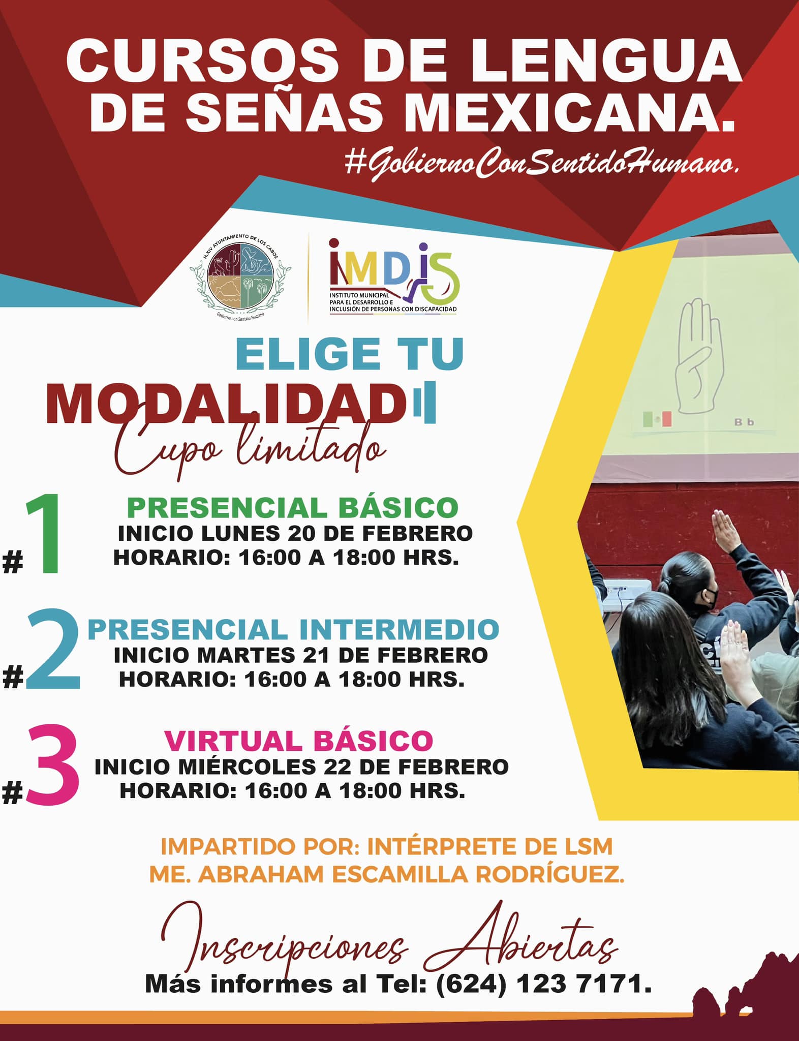 El XIV Ayuntamiento de Los Cabos que preside Oscar Leggs Castro, a través del Instituto Municipal para el Desarrollo e Inclusión de Personas con Discapacidad (IMDIS), a cargo de Esmeralda Guadalupe Ceseña Coria, invita a la ciudadanía a que participen en el “Curso de Lengua de Señas Mexicana (LSM)”, que será impartido por el intérprete de LSM Abraham Escamilla Rodríguez, de manera presencial los días 20 y 21 de febrero de 4:00 a 6:00 de la tarde; el curso iniciará con el nivel básico e intermedio, y se impartirá de manera virtual el 22 de febrero en el mismo horario; cabe destacar que el curso es totalmente gratuito.