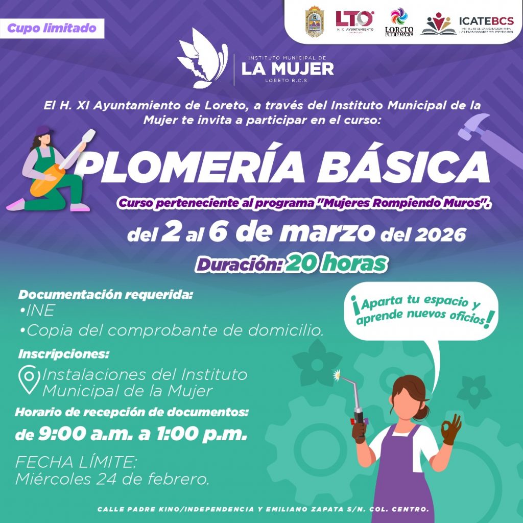 Loreto, B.C.S., 19 de febrero de 2026.-Para las mujeres no existen límites cuando se trata de crecer, superarse y aprender oficios que históricamente han sido considerados exclusivos de los hombres, afirmó la directora del Instituto Municipal de la Mujer en Loreto (IMM), Juanita Cruz Ramos, al invitar a participar en el curso de Plomería Básica del programa Mujeres Rompiendo Muros.