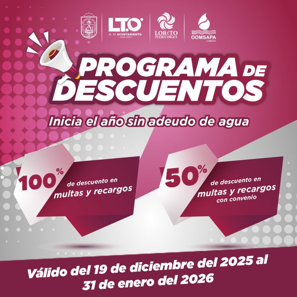 Loreto, B.C.S. 23 de diciembre, 2025.– Con el objetivo de apoyar la economía familiar, el Organismo Operador Municipal de Agua Potable y Alcantarillado de Loreto (OOMSAPAL), ha puesto en marcha un programa de descuentos especiales para que la ciudadanía inicie el 2026 libre de adeudos por este concepto.