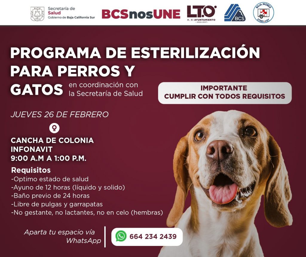 Loreto, B.C.S., 24 de febrero de 2026.– El XI Ayuntamiento de Loreto en coordinación con la Secretaría de Salud, invita a la ciudadanía a participar en una nueva jornada del programa permanente de esterilización para perros y gatos, que se llevará a cabo el próximo 26 de febrero en la cancha de la colonia Infonavit, en un horario de 9:00 de la mañana a 1:00 de la tarde.