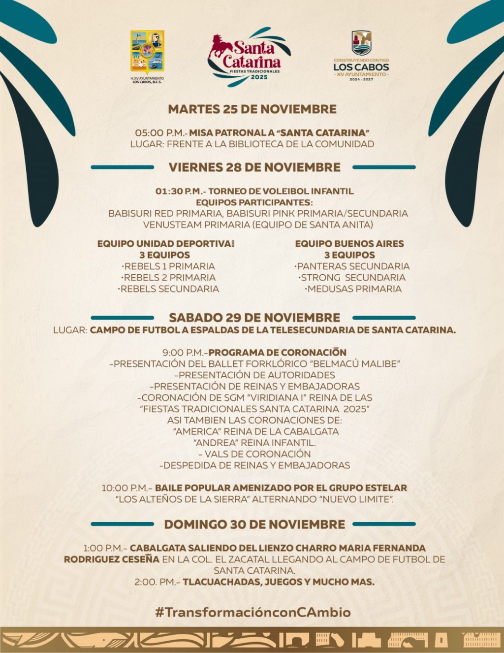 Los Cabos, Baja California Sur | 24 de noviembre del 2025.– El XV Ayuntamiento de Los Cabos, a través de la Dirección General de Desarrollo Social, a través de la Dirección Municipal de Organización y Participación Ciudadana, invita a la comunidad a participar en las Fiestas Tradicionales de Santa Catarina 2025, que se realizarán del 25 al 30 de noviembre, con un programa que integra actividades religiosas, deportivas, culturales y artísticas para fortalecer la convivencia y preservar las tradiciones de esta localidad.