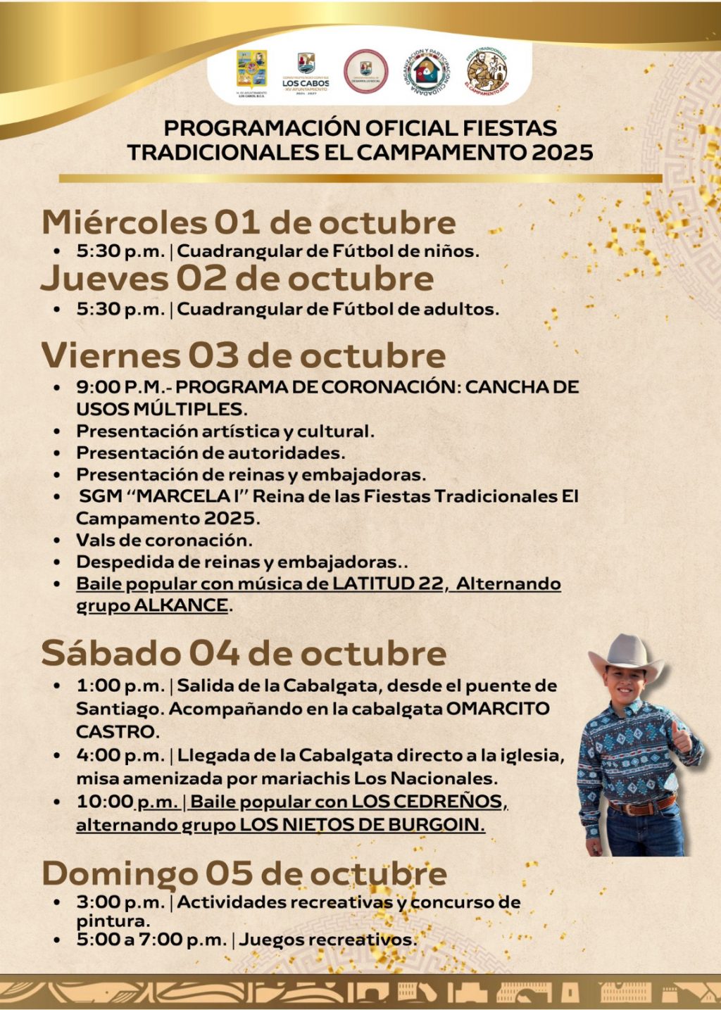 Los Cabos, Baja California Sur | 2 de octubre del 2025.- Con el propósito de fortalecer la identidad cultural, promover la convivencia familiar y preservar las costumbres de la comunidad, este miércoles 1 de octubre dieron inicio las Fiestas Tradicionales El Campamento 2025, mismas se celebran del 1 al 5 de octubre en la delegación de Santiago.