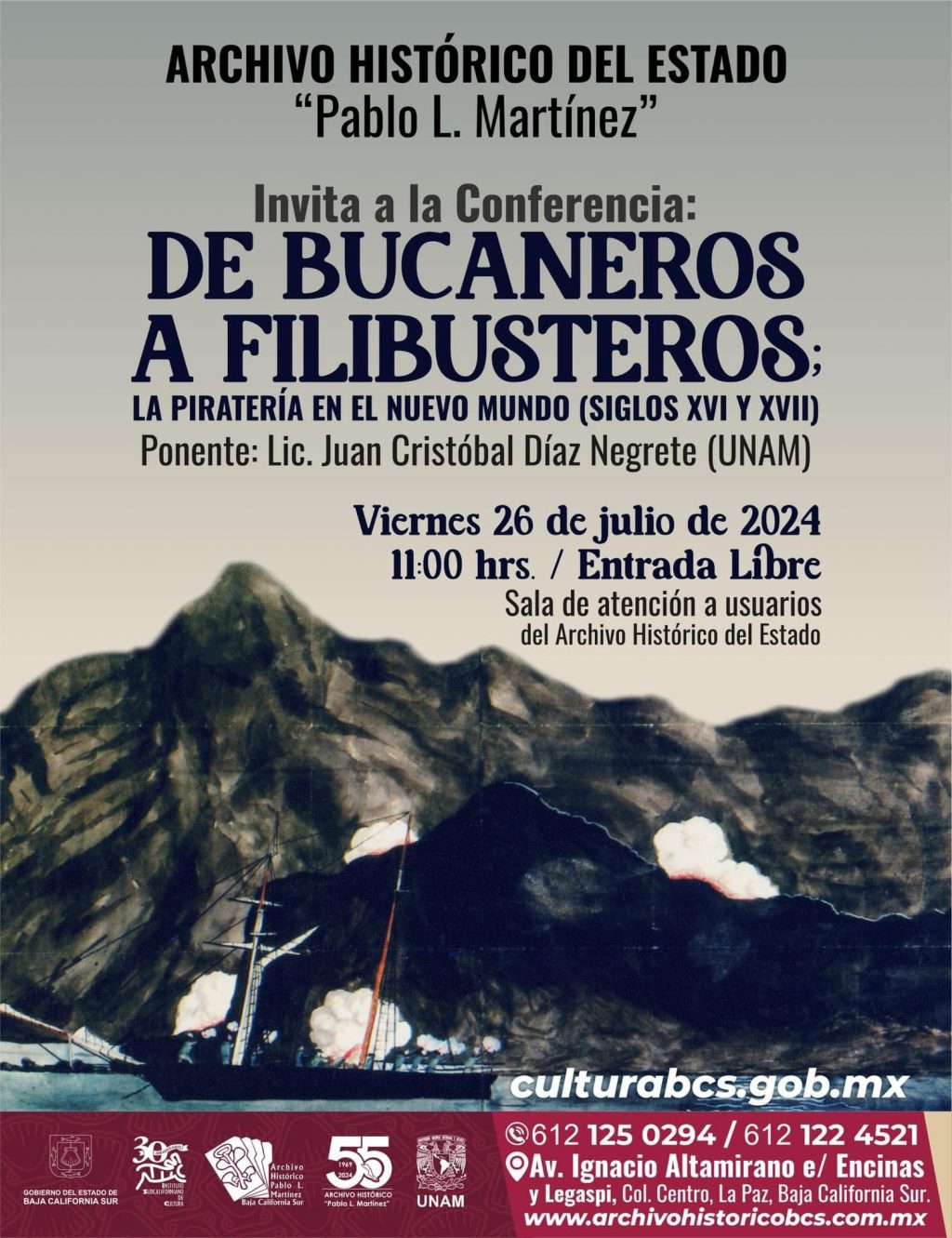 El Instituto Sudcaliforniano de Cultura invita a toda la comunidad a la conferencia titulada «De bucaneros a filibusteros; la piratería en el nuevo mundo (siglos XVI y XVII)», impartida por el destacado ponente Juan Cristóbal Díaz Negrete, académico de la Universidad Nacional Autónoma de México (UNAM).