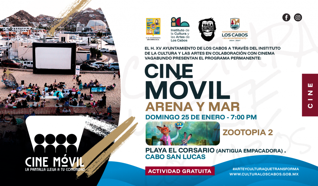 Los Cabos, Baja California Sur | 24 de enero del 2026.– El XV Ayuntamiento de Los Cabos, a través del Instituto de la Cultura y las Artes (ICA), y en colaboración con Cinema Vagabundo, invita a la ciudadanía a disfrutar de una función especial de cine al aire libre en playa El Corsario, en Cabo San Lucas.