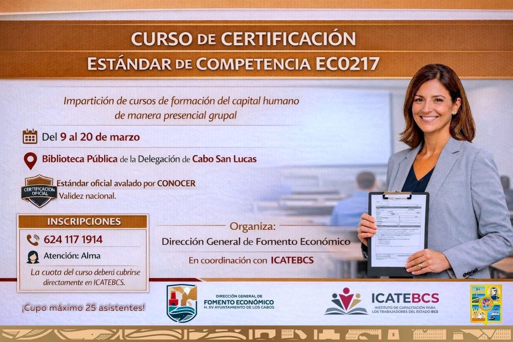 Los Cabos, Baja California Sur | 20 de febrero del 2026.– El XV Ayuntamiento de Los Cabos, a través de la Dirección General de Fomento Económico, convoca a instructores, capacitadores y profesionales de la enseñanza a participar en el Curso de Certificación en el Estándar de Competencia EC0217, enfocado en la impartición de cursos de formación del capital humano de manera presencial grupal.