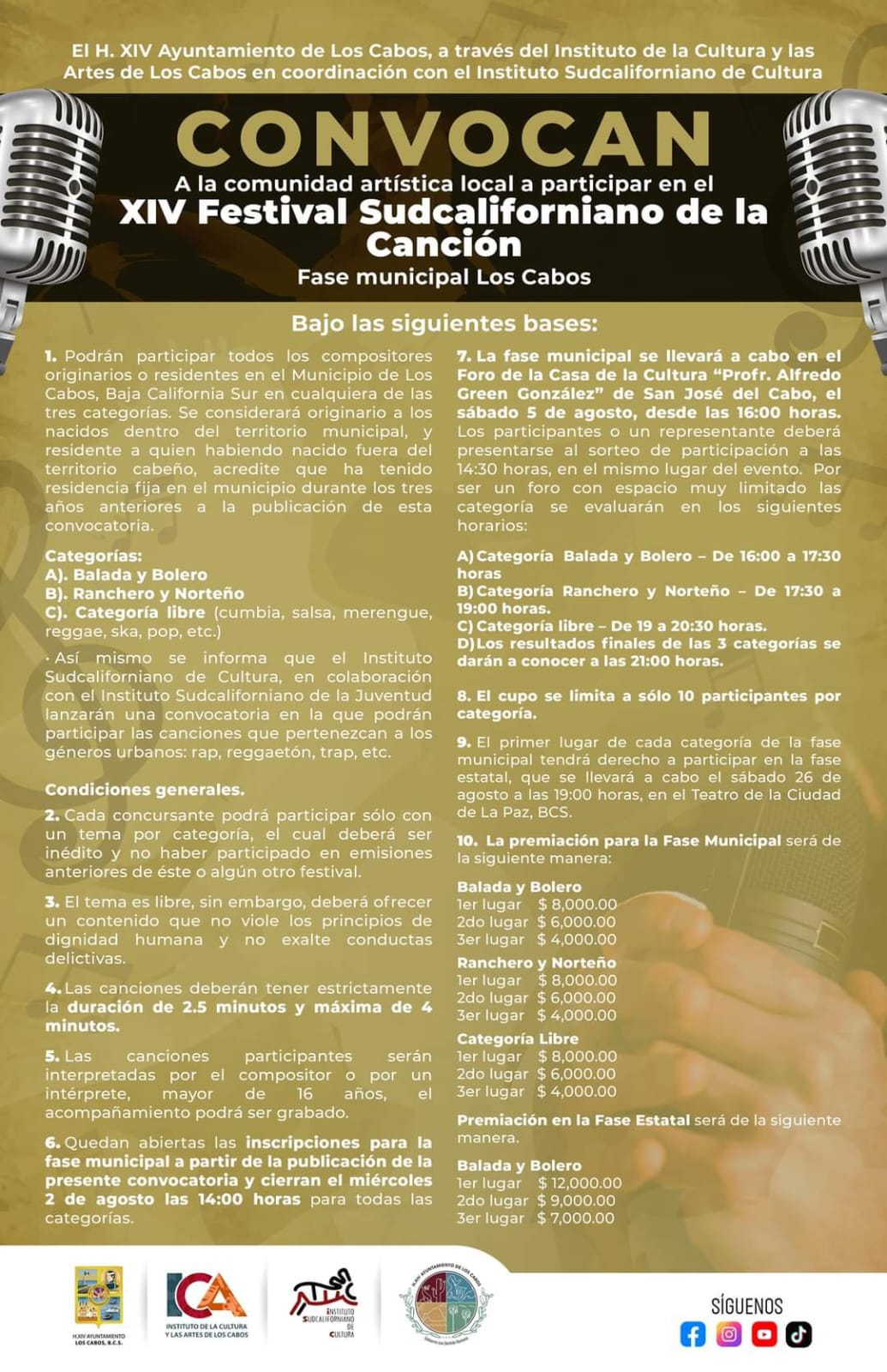 El XIV Ayuntamiento de Los Cabos que preside Oscar Leggs Castro, a través del Instituto de la Cultura y Las Artes (ICA) invitan a la comunidad artística a participar en la fase municipal del Festival Sudcaliforniano de la Canción en su edición XIV, evento que se realiza en coordinación con el Instituto de Cultura de Baja California Sur.