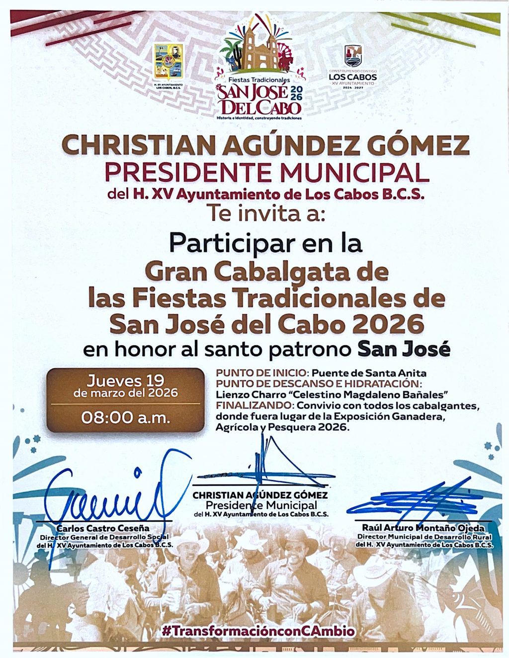 Los Cabos, Baja California Sur | 5 de marzo del 2026.– El XV Ayuntamiento de Los Cabos, a través de la Dirección General de Desarrollo Social, la Dirección Municipal de Desarrollo Rural y el Comité Organizador de las Fiestas Tradicionales San José del Cabo 2026, convocó a jinetes, asociaciones ecuestres y ciudadanía en general a participar en la Gran Cabalgata y en la elección de la Reina de los Cabalgantes.