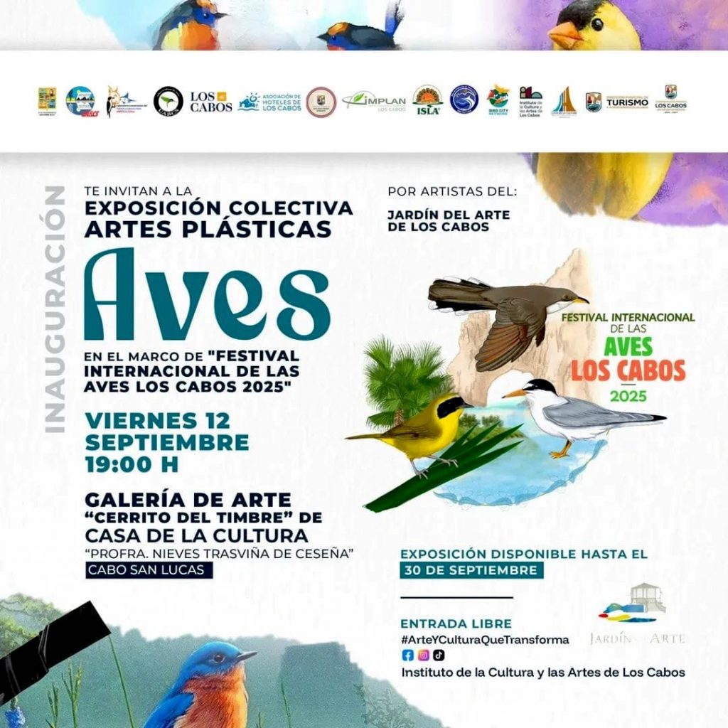 Los Cabos, Baja California Sur | 11 de septiembre del 2025.– El XV Ayuntamiento de Los Cabos, en coordinación con el comité organizador del Festival Internacional de las Aves Los Cabos 2025, invita a la ciudadanía a la inauguración de la Exposición Colectiva de Artes Plásticas “Aves”, realizada por artistas del Jardín del Arte de Los Cabos.