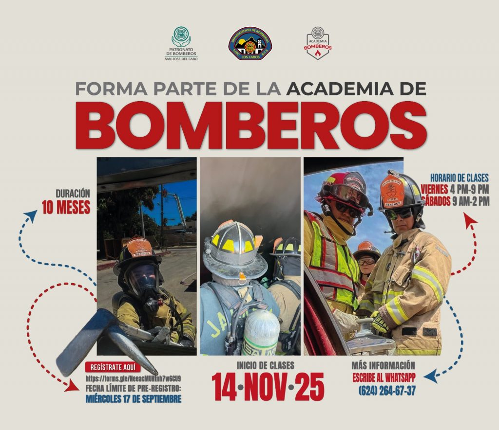 Los Cabos, Baja California Sur | 31 de agosto del 2025.– El Departamento de Bomberos de San José del Cabo, encabezado por el comandante Omar Barreras Núñez, anunció la apertura de la convocatoria para integrar la séptima generación de la Academia de Bomberos, dirigida a personas con al menos 17 años y 6 meses cumplidos que deseen recibir una formación teórica y práctica para convertirse en bomberos profesionales. Las clases darán inicio el viernes 14 de noviembre de 2025, previo a una prueba física de selección.
