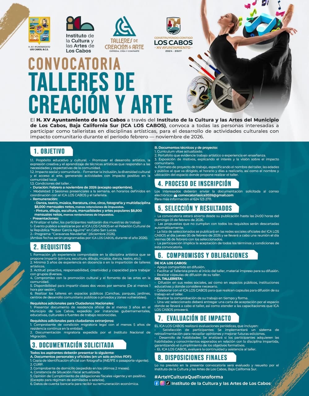 Los Cabos, Baja California Sur | 17 de enero del 2026.– El XV Ayuntamiento de Los Cabos, a través del Instituto de la Cultura y las Artes (ICA), convoca a artistas, educadores y profesionales del ámbito cultural a participar en el programa “Talleres de Creación y Arte 2026”, cuyo objetivo es impulsar el desarrollo artístico, la expresión creativa y el aprendizaje de diversas disciplinas, mediante actividades que se llevarán a cabo en canchas, parques, jardines, centros de desarrollo comunitario públicos o privados, así como en zonas consideradas vulnerables del municipio.