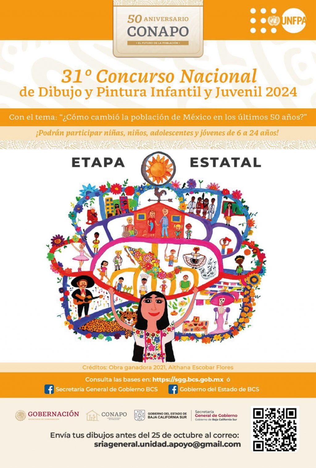 El gobierno de Baja California Sur, a través de la Secretaría General de Gobierno, en coordinación con la Secretaría General del Consejo Nacional de Población (CONAPO) y el Fondo de Población de las Naciones Unidas (UNFPA), convocan a niñas, niños, adolescentes y jóvenes de 6 a 24 años, a participar en la edición número 31 del Concurso Nacional de Dibujo y Pintura Infantil y Juvenil, 2024. Con el tema: “¿Cómo cambió la población de México en los últimos 50 años?”.