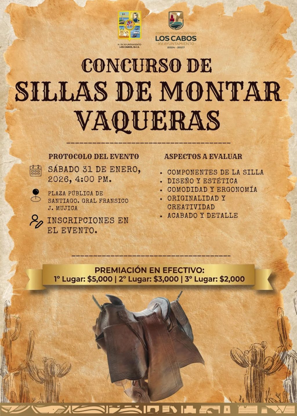 Los Cabos, Baja California Sur | 27 de enero del 2026.– Con el fin de preservar y fortalecer las tradiciones del municipio, el XV Ayuntamiento de Los Cabos, a través de la Dirección Municipal de Desarrollo Rural invita a la ciudadanía a participar en el Concurso de Sillas de Montar Vaqueras, que se realizará en el marco del Primer Festival “Memorias del Ranchero Sudcaliforniano”.