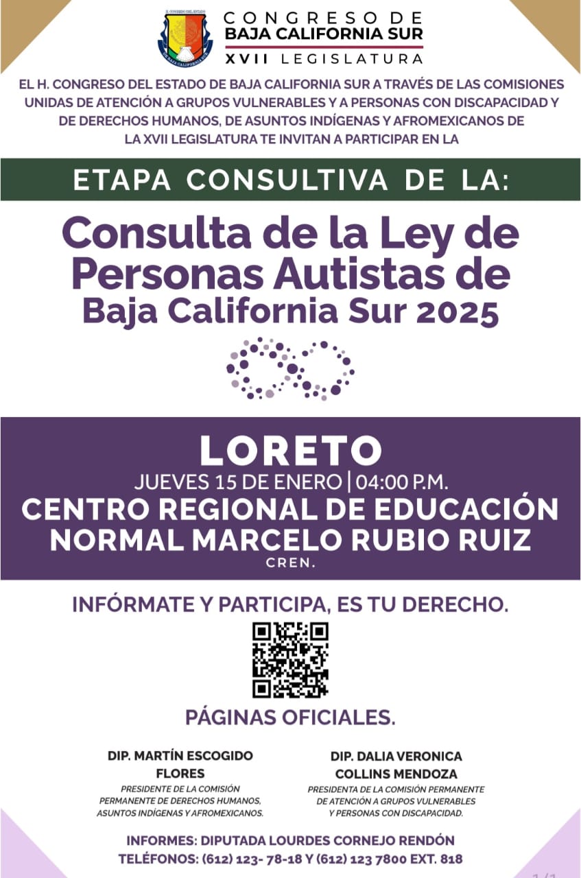 Loreto, B.C.S. 12 de enero, 2026.- En seguimiento al proceso legislativo de consulta para la Ley de Personas Autistas de BCS, el XI Ayuntamiento de Loreto informa que este jueves 15 de enero, se llevará a cabo la Etapa Consultiva para la conformación de esta nueva ley que busca garantizar el pleno respeto de los derechos de las personas con esta condición.