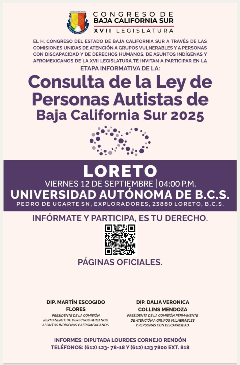 La consulta está dirigida a personas con TEA, familiares, cuidadores y Asociaciones Civiles, se realizará día 12 de septiembre a las 16:00 horas en las instalaciones de la UABCS ext. Loreto y contará con la asistencia del Diputado Martín Escogido presidente de la Comisión Permanente de Derechos Humanos y Asuntos Indígenas, y la Diputada Dalia Collins Mendoza, presidenta de la Comisión Permanente de Atención a Grupos Vulnerables y Personas con Discapacidad.
