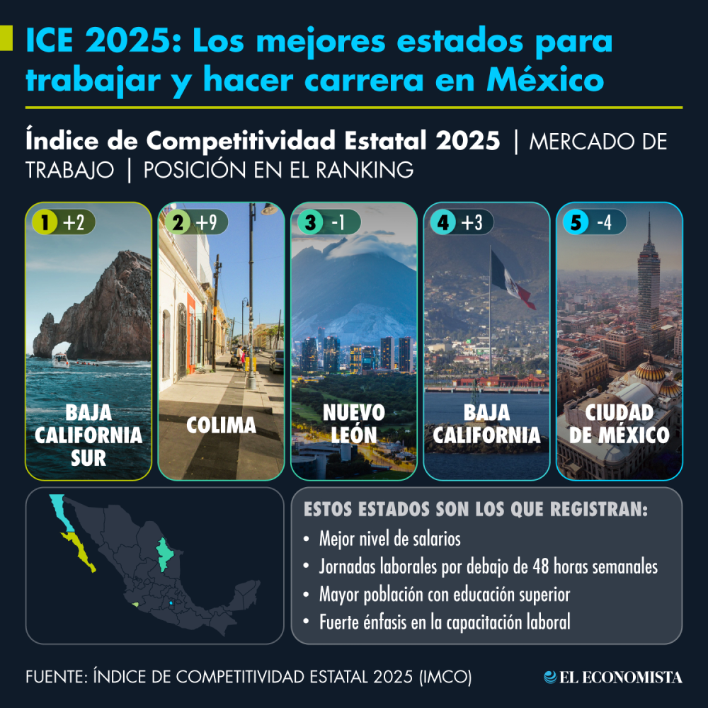 La mayoría de las entidades que mostraron alto nivel de competitividad laboral se encuentran en el norte del país.De acuerdo con el subíndice de Mercado de trabajo del Índice de Competitividad Estatal (ICE) 2025 del IMCO, Baja California Sur se posiciona como la mejor entidad para trabajar y desarrollar una carrera profesional en México. La mayoría de los estados del norte del país ofrecen las mejores condiciones laborales, lo que los convierte en destinos atractivos para el talento.