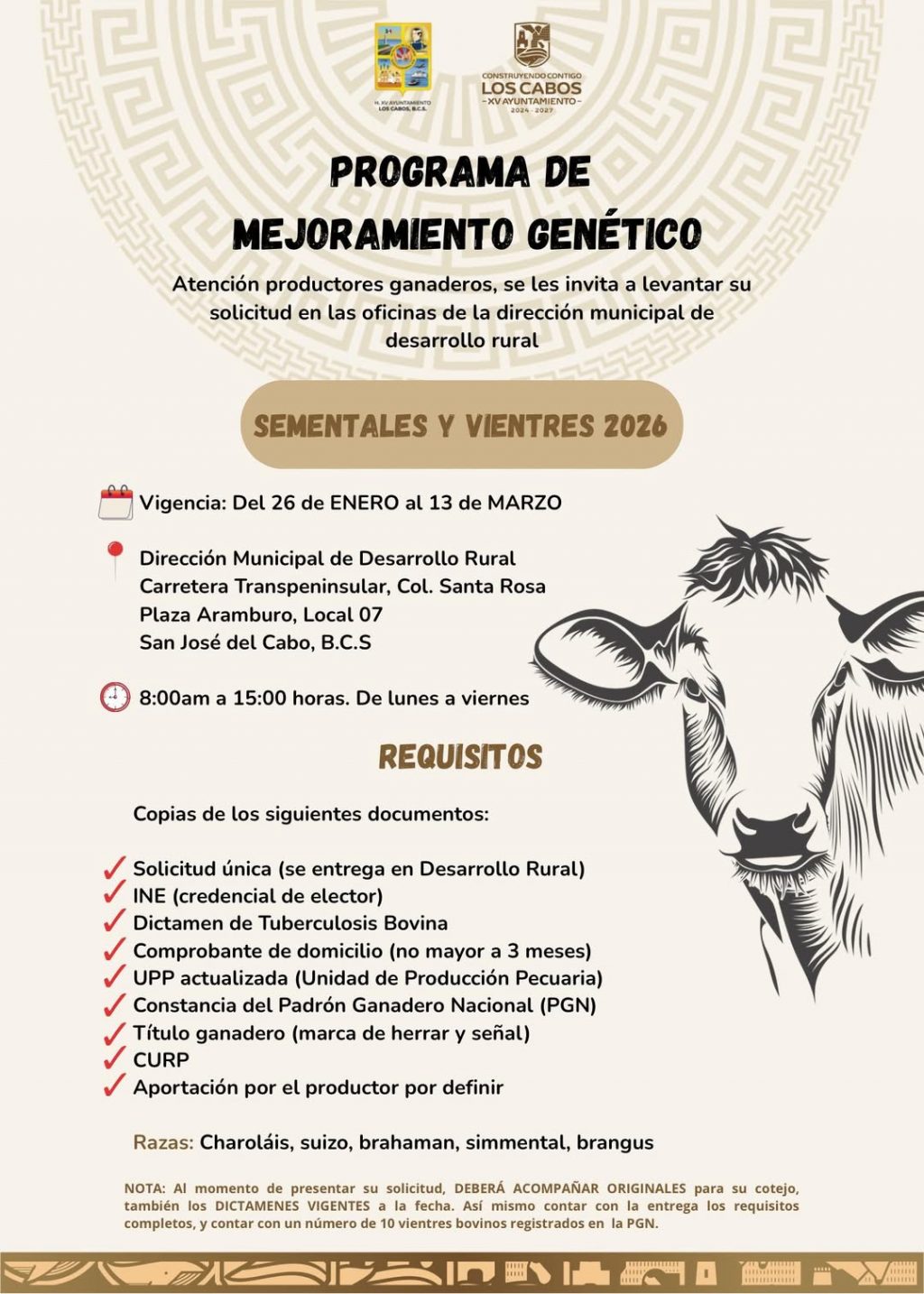 Los Cabos, Baja California Sur | 2 de febrero del 2026.– Con el objetivo de fortalecer la productividad del sector ganadero y mejorar la calidad genética del hato bovino en el municipio, el XV Ayuntamiento de Los Cabos, a través de la Dirección Municipal de Desarrollo Rural, invita a las personas productoras ganaderas a participar en el Programa de Mejoramiento Genético 2026, enfocado en la adquisición de vientres y sementales de alta calidad.