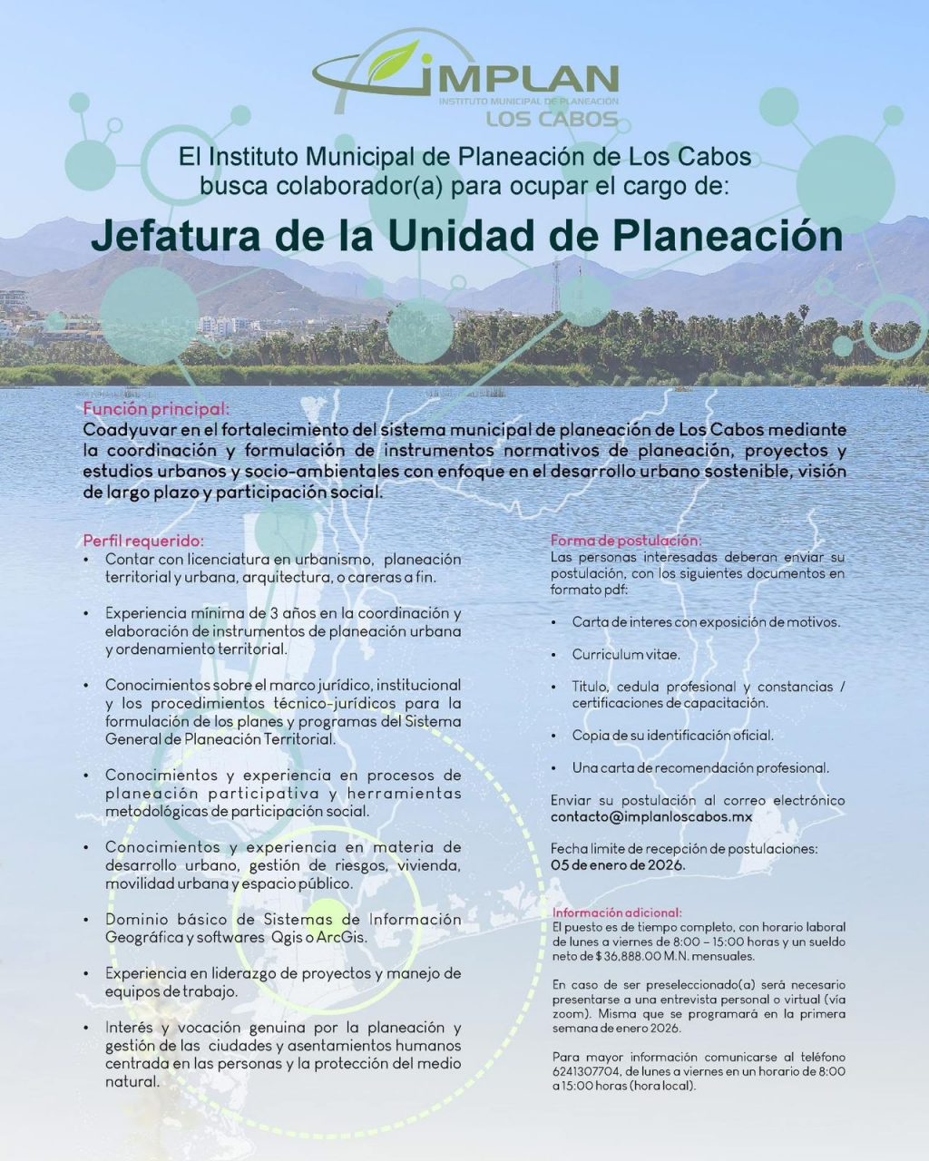 Los Cabos, Baja California Sur 20 de diciembre del 2025.- Con el objetivo de fortalecer el sistema municipal de planeación y los procesos técnicos que contribuyen al desarrollo urbano del municipio, el XV Ayuntamiento de Los Cabos, publicó la convocatoria emitida por el Instituto Municipal de Planeación (IMPLAN) para ocupar la Jefatura de la Unidad de Planeación.