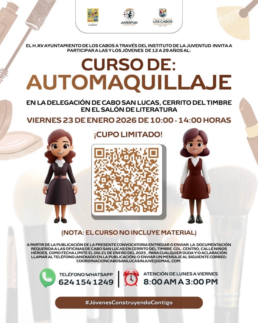 Los Cabos, Baja California Sur | 14 de enero del 2026.– El XV Ayuntamiento de Los Cabos, a través del Instituto de la Juventud (INJUVE), lanzó la convocatoria para participar en el Curso Intensivo de Automaquillaje de Día, dirigido a jóvenes de entre 12 y 29 años de edad.