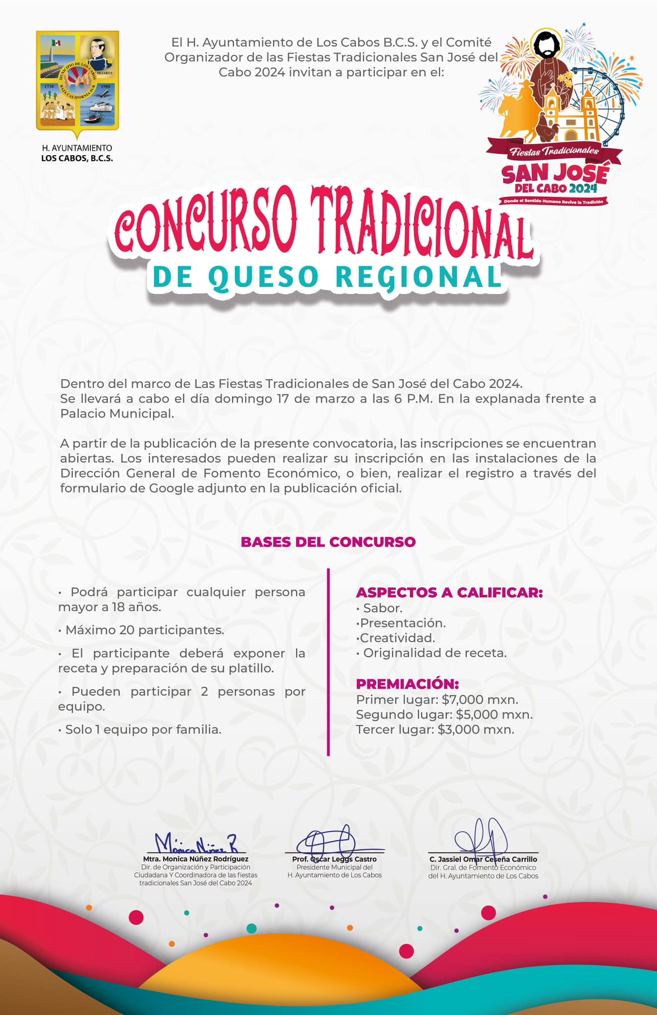 Como parte de las Fiestas Tradicionales San José del Cabo 2024, se llevará a cabo el ‘’Concurso de Queso Regional’’ el próximo 17 de marzo a las 6:00 de la tarde en la explanada frente al Palacio Municipal; por ello el Comité Organizador invita a la ciudadanía a participar.