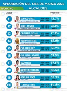 En la evaluación mensual que hizo Demoscopia Digital, nos muestra que la población cabeña, calificó a su gobernante municipal, con una aprobación del 67.5 por ciento, y eso le permitió ocupar el séptimo puesto a nivel nacional, pero con una clara ventaja sobre personajes de la política nacional, y en especial al que se maneja como ya casi candidato presidencial, como lo es el alcalde de Monterrey, en el estado de Nuevo León, Luis Donaldo Colosio, quien su población lo calificó con un porcentaje del 61.8 por ciento, para ubicarlo en la posición número 19 del ranking nacional, o el caso de Geraldine Ponce, alcaldesa de Tepic, estado de Nayarit, de quien se dice es la favorita del Presidente de la República, que obtuvo una aprobación del 65.3 por ciento, ubicándose en el ranking nacional, en el noveno lugar. O de Claudia Bruguera, alcaldesa de la delegación de Iztapalapa, en la Ciudad de México, donde gobierna a 4 millones de habitantes, apenas logró un consenso a su favor de 60 % y está ubicada en esta lista, en el número 25.