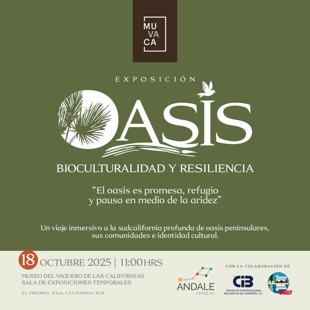 La Paz, B.C.S., 16 de octubre de 2025 — Ándale La Paz, A.C. invita cordialmente a la inauguración de la exposición Oasis: Bioculturalidad y Resiliencia, que tendrá lugar el próximo sábado 18 de octubre a las 11:00 a.m. en la Sala de Exhibiciones Temporales del Museo del Vaquero de las Californias (MUVACA), ubicado en El Triunfo, Baja California Sur.