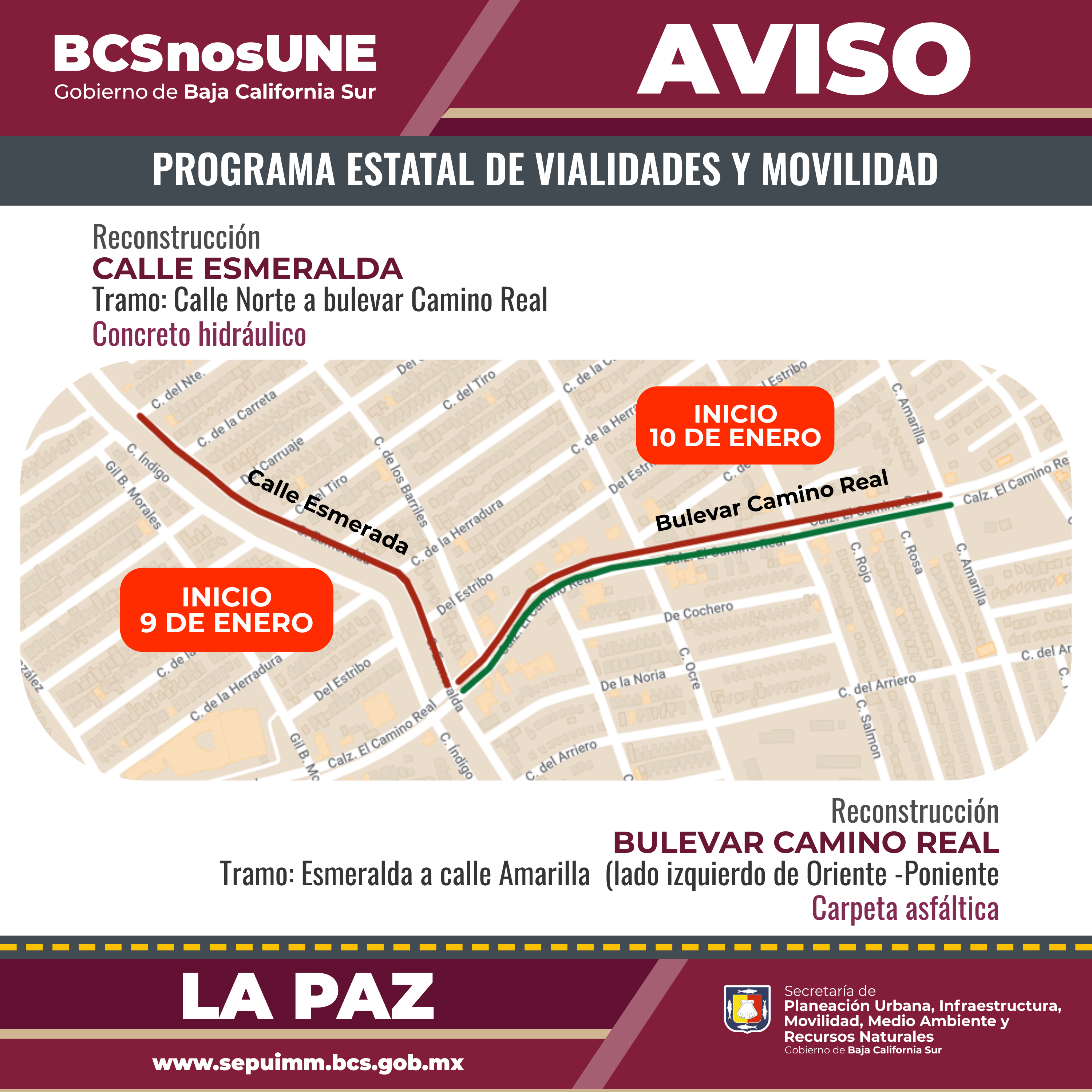 El 10 de enero, la reconstrucción con carpeta asfáltica del bulevar Camino Real, tramo: Esmeralda a calle Amarilla (lado izquierdo de Oriente -Poniente); y la rehabilitación con carpeta asfáltica del crucero carretera Transpeninsular La Paz- San José del Cabo con bulevar Camino Real; es importante destacar que el acceso a la colonia Camino Real será por la calle Artículo 115, con la habilitación de un 4 altos provisional en el cruce con la carretera.