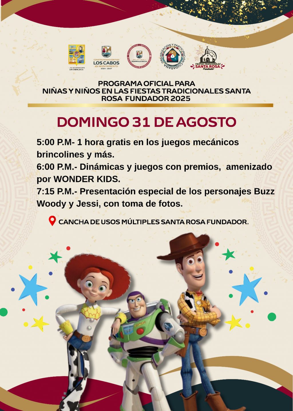 Los Cabos, Baja California Sur | 28 de agosto del 2025.- XV Ayuntamiento de Los Cabos da a conocer que este domingo 31 de agosto, en el marco de las Fiestas Tradicionales Santa Rosa Fundador 2025, se desarrollará un programa especial dirigido a la niñez, con actividades gratuitas y espectáculos pensados para fomentar la convivencia familiar.