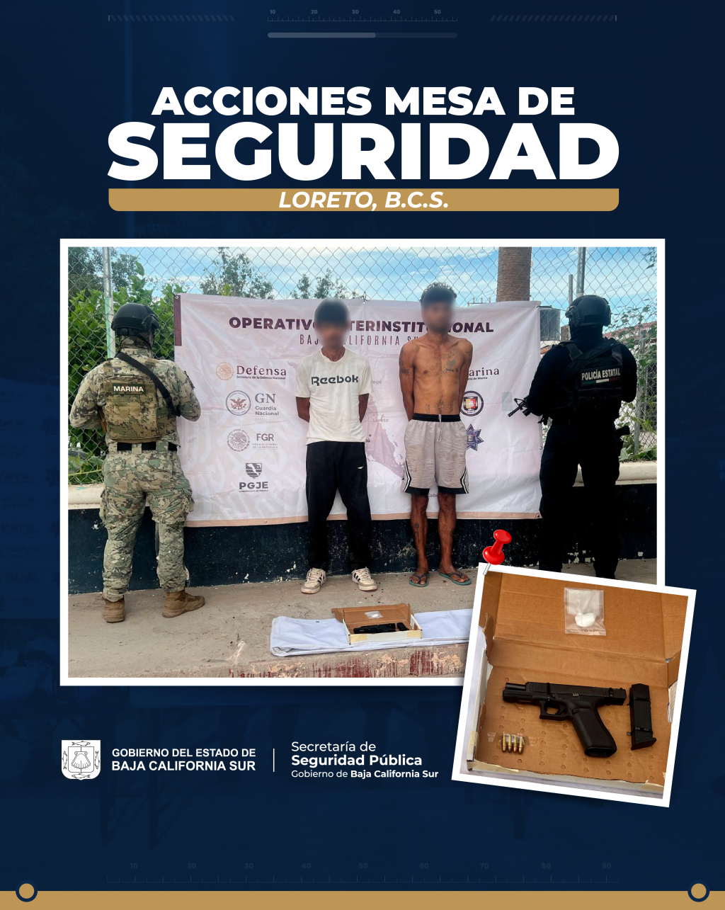 En el marco de las acciones operativas que despliega la Mesa Estatal de Seguridad en el norte del estado, personal de Secretaría de Marina y de Policía Estatal Preventiva, en coordinación con Secretaría de la Defensa Nacional, Guardia Nacional, Fiscalía General de la República, Centro Nacional de Inteligencia, Procuraduría General de Justicia del Estado, Policía Estatal y Municipal Preventiva, logró la detención en el municipio de Loreto, de dos personas en posesión de un arma de fuego.