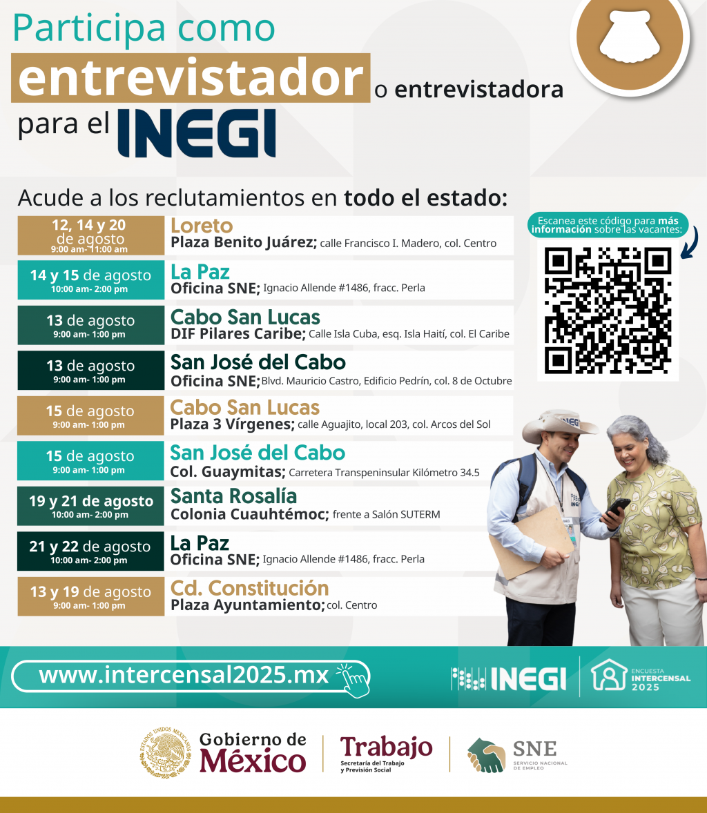 La Secretaría del Trabajo, Bienestar y Desarrollo Social (STByDS), a través del Servicio Nacional de Empleo en Baja California Sur (SNE-BCS), convoca a la ciudadanía interesada a participar en los procesos de reclutamiento para cubrir vacantes en el Instituto Nacional de Estadística y Geografía (INEGI), disponibles en los cinco municipios del estado.