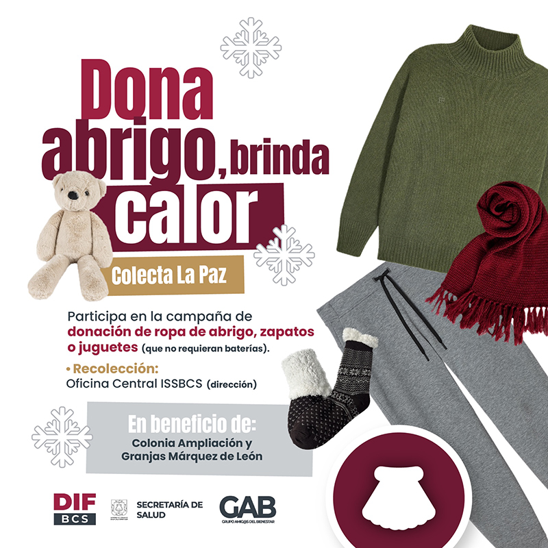 A través de su Grupo Amigos de Bienestar (GAB), la Secretaría de Salud de Baja California Sur organiza una colecta de abrigos y zapatos que se entregarán durante la temporada decembrina a familias de la colonia Ampliación y Granjas Márquez de León, en la zona periférica de la Ciudad de La Paz, con la finalidad de que se protejan de los cambios de temperaturas.