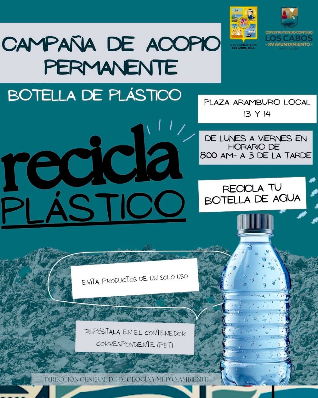 Los Cabos, Baja California Sur | 7 de marzo del 2026.– Con el objetivo de fortalecer la cultura del reciclaje y mejorar la gestión de residuos en el municipio, el XV Ayuntamiento de Los Cabos, a través de la Dirección General de Ecología y Medio Ambiente, mantiene una campaña permanente de acopio de plástico PET para facilitar su correcta disposición y evitar que termine contaminando calles, arroyos o ecosistemas marinos.