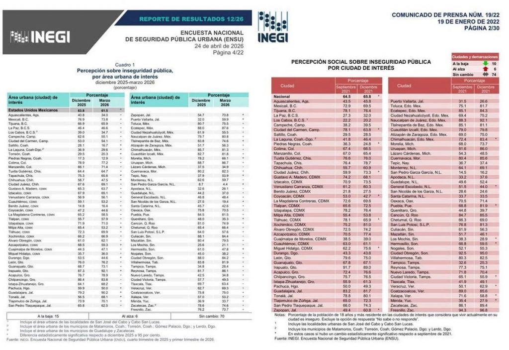 De acuerdo con la Encuesta Nacional de Seguridad Pública Urbana (ENSU), al inicio de la actual administración, en octubre de 2021, el 27.3% de la población consideraba insegura la ciudad. Para el primer trimestre de 2026, ese indicador se ubicó en 46.6%, lo que representa un incremento de 19.3 puntos porcentuales.